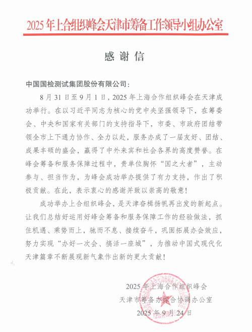 | 感謝信 | 國檢集團優質技術服務助力上合組織天津峰會成功舉辦 |